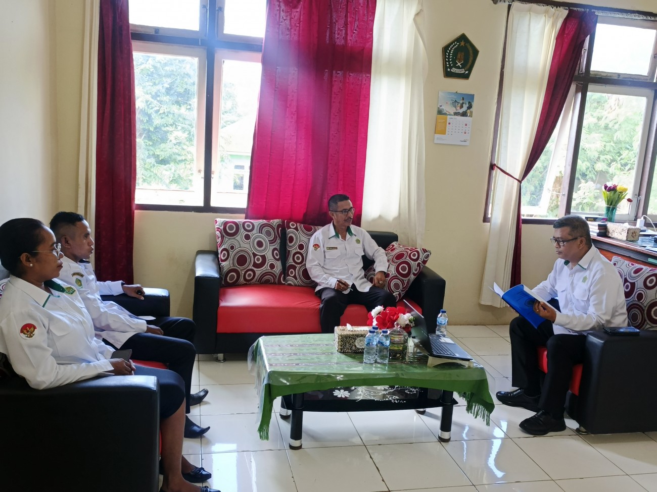 Saumlaki, inmas - Kepala Kantor Kementerian Agama Kabupaten Kepulauan Tanimbar, Aloysius Paskhalis Rumwarin, S. Fil disamping Kasi Pendidikan Agama Kristen, Fernolof Unitly, S. PdK menerima kunjungan Kepala Sekolah SMTK Sola Gratia Saumlaki Steven Weriratan.S.Sos bersama Wakasek Humas, Helmy Tanate, S. Pd., M. Pd dalam rangka koordinasi persiapan perubahan nomenklatur Sekolah yang berlangsung di ruang kerja, pada senin 16/06.